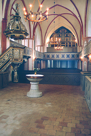 Der Innenraum der Kirche ist ein dreischiffiger Hallenbau mit kreuzgeripptem Gewölbe. Besonders ist die Innenausstattung - Altaraufsatz und Kanzel wurden von Dittrich Hartung aus Rostock im frühen 18. Jahrhundert geschaffen.